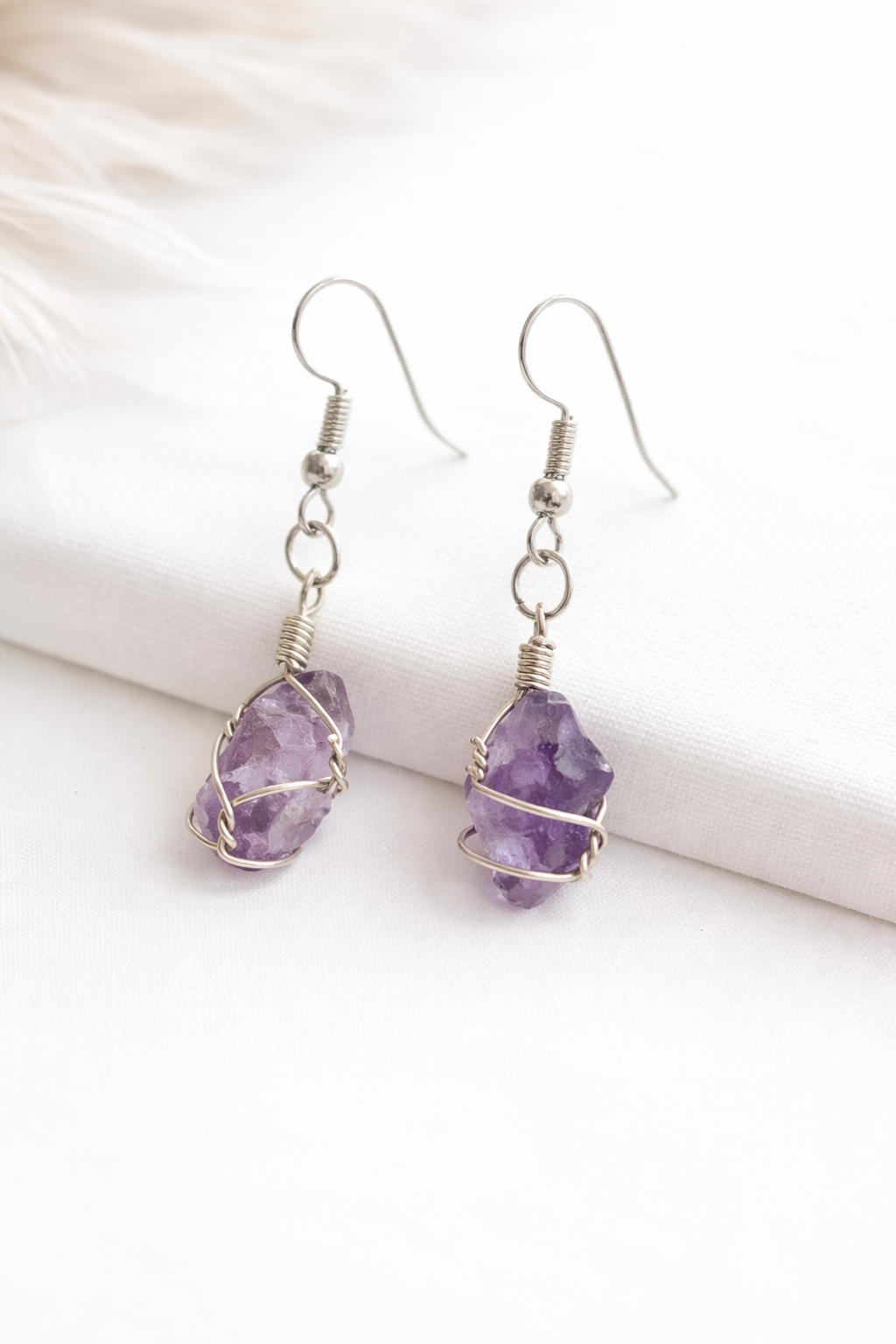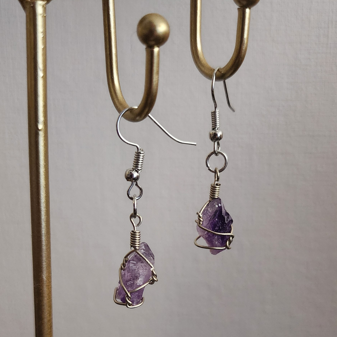 Aros artesanales elaborados con amatista natural en estado bruto, envuelta cuidadosamente en alambre metálico que realza la forma orgánica y única de cada piedra. Su tono violeta suave aporta elegancia, espiritualidad y un estilo consciente.