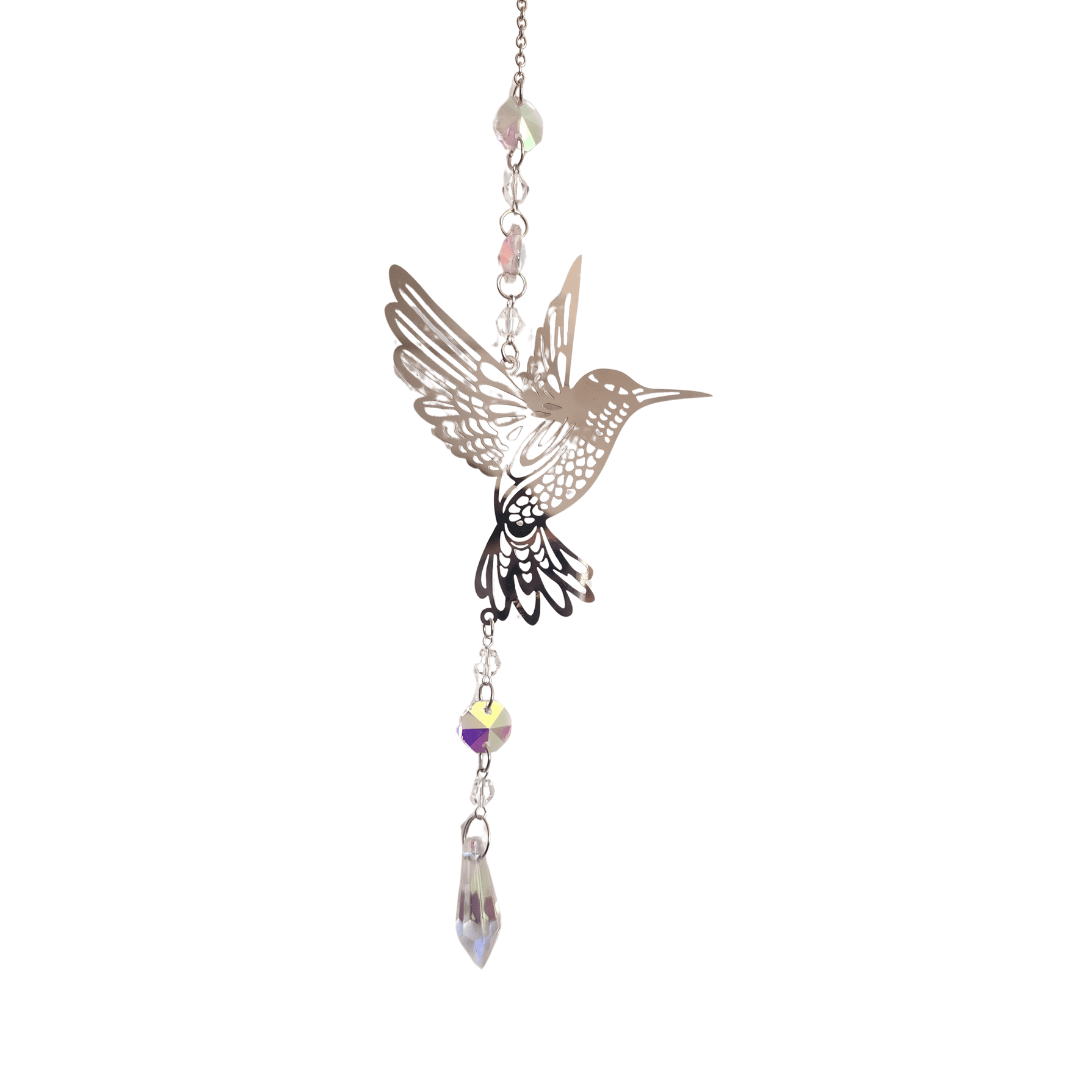 Este hermoso atrapasol con diseño de colibrí combina elegancia y simbolismo espiritual. Fabricado en metal con delicados detalles calados, incluye cristales facetados que al reflejar la luz del sol proyectan destellos de colores, llenando el espacio de energía y alegría.
