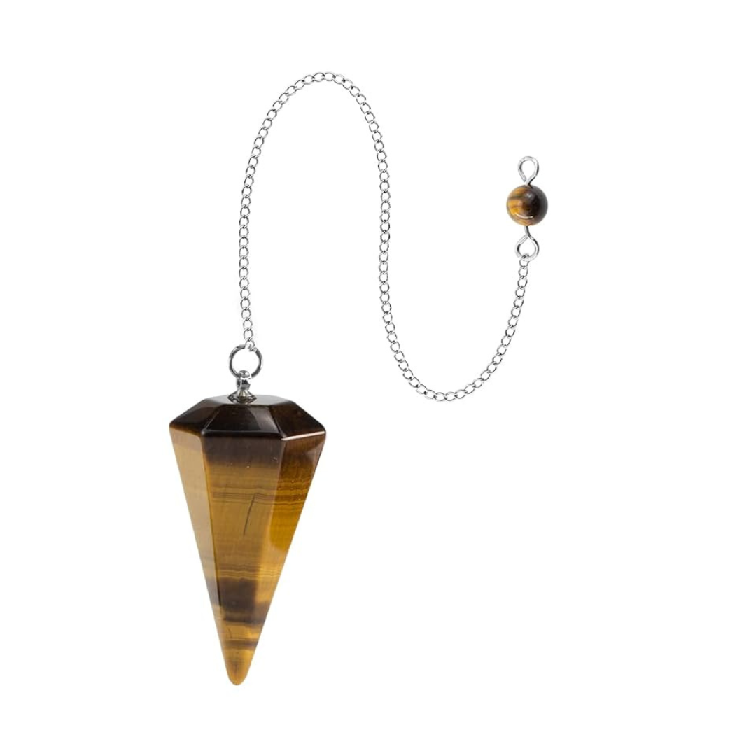 El péndulo de Ojo de Tigre es un amuleto de fuerza, protección y claridad. Su brillo dorado y marrón refleja la energía de la tierra y el sol, otorgando equilibrio entre lo material y lo espiritual.